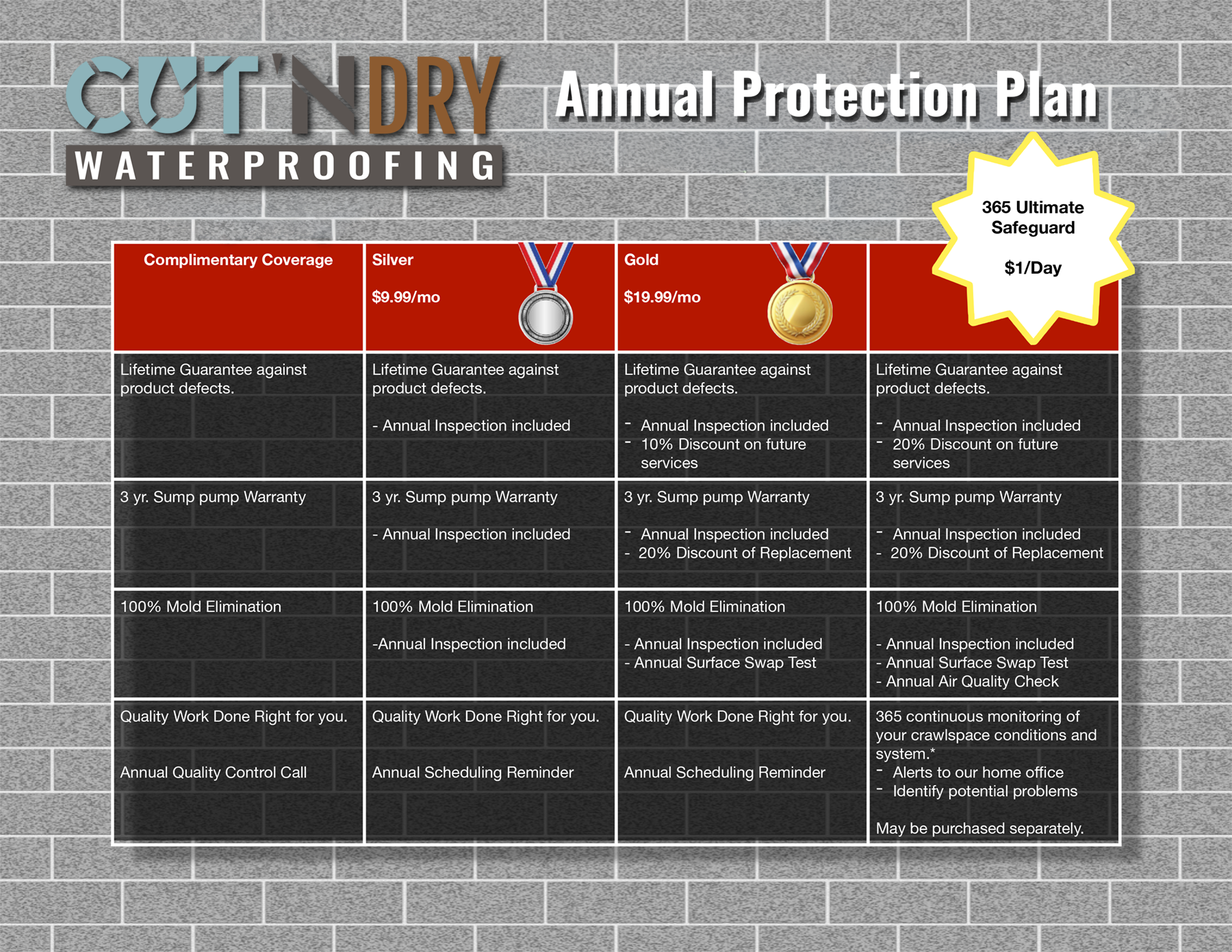 The Cut ’N Dry Annual Protection Plan offers four levels, from free lifetime product guarantees to advanced options with inspections, surface testing, air quality checks, and extra oversight.